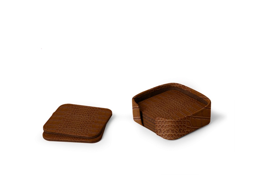 Set of 6 square coasters - Camel - Crocodile style calfskin