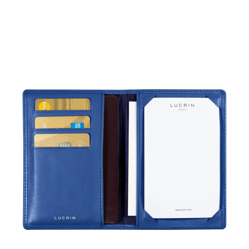 Pocket-sized note pad in full grain leather. Inside 2 pockets on the left, one for business cards and one large vertical passport format. On the right side, note pad and one large vertical pocket.